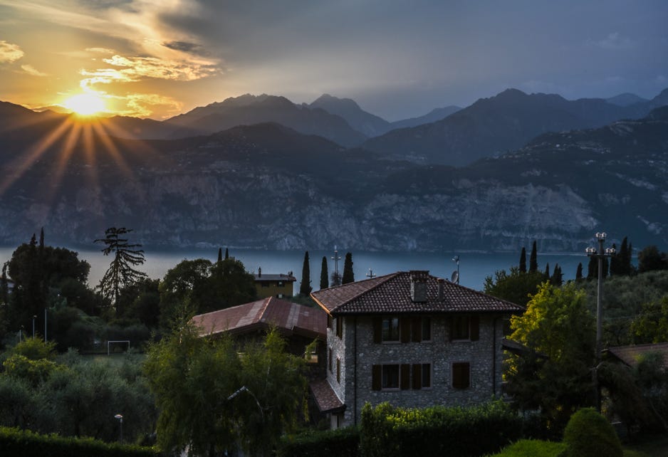 Da bin ich doch heilfroh, dass mein Hotel Val Di Monte in den Bergen oberhalb von Malcesine liegt. Auch wenn man einen dreissig minütigen Fussmarsch auf sich nehmen muss, um ohne Auto in den Ort zu kommen, so ist die Ruhe, abgesehen von einigen irre kläffenden Kötern in der Nachbarschaft, und Die Aussicht auf die Berge und den See, doch obere Sahne.