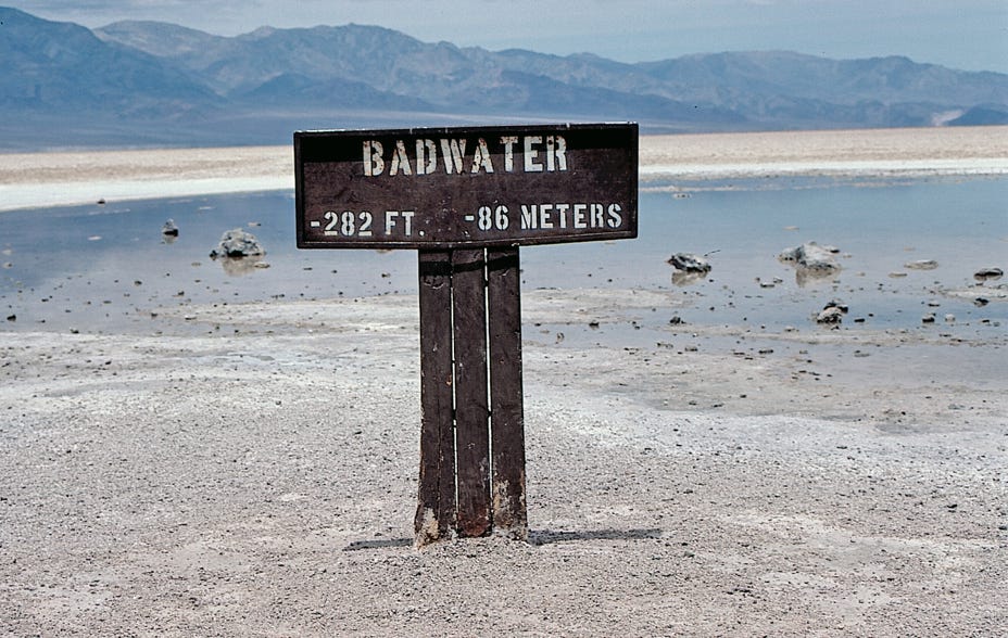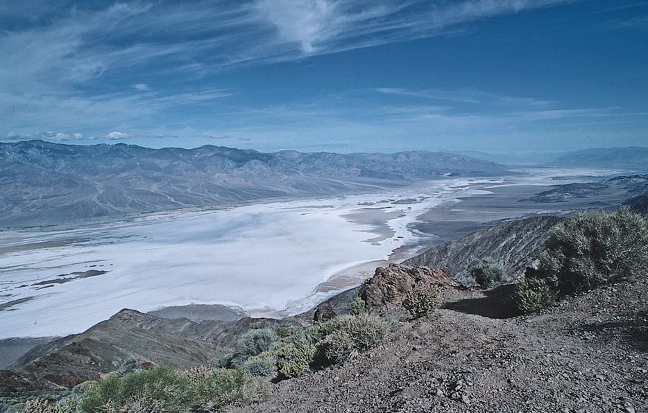 Durch die Mojave Wüste geht es zum Death Valley. Kaum zu glauben, wie heiß es hier ist. Am Zebriskie Point sieht es ziemlich trostlos aus. Bei Badwater liegt die tiefste Stelle der USA.
