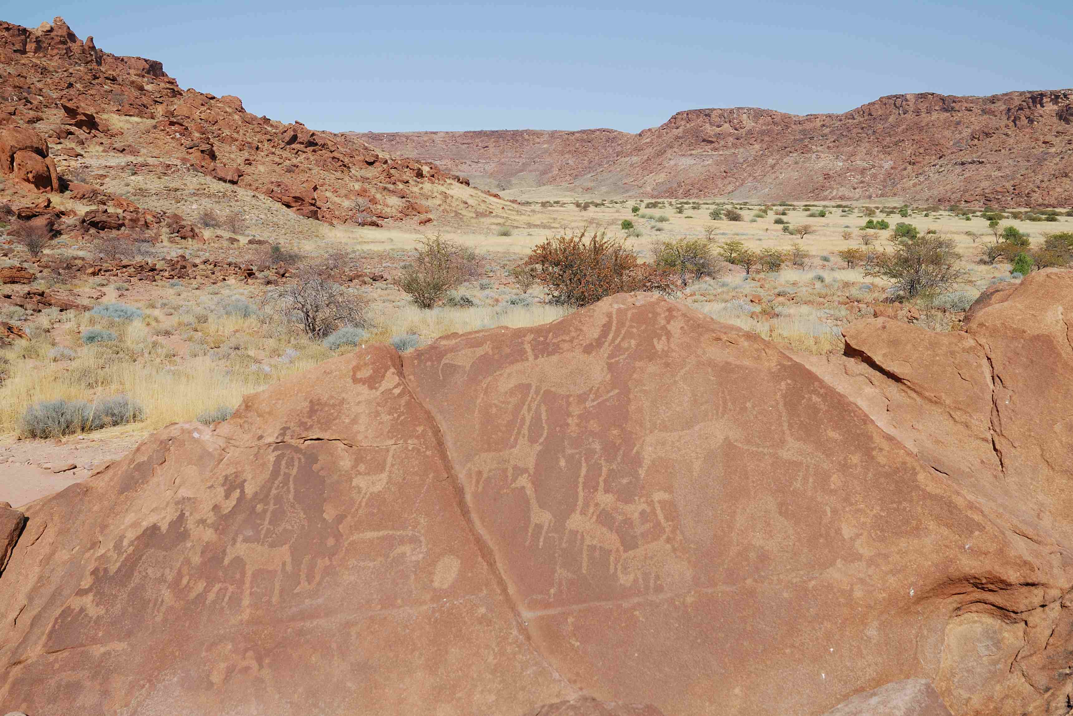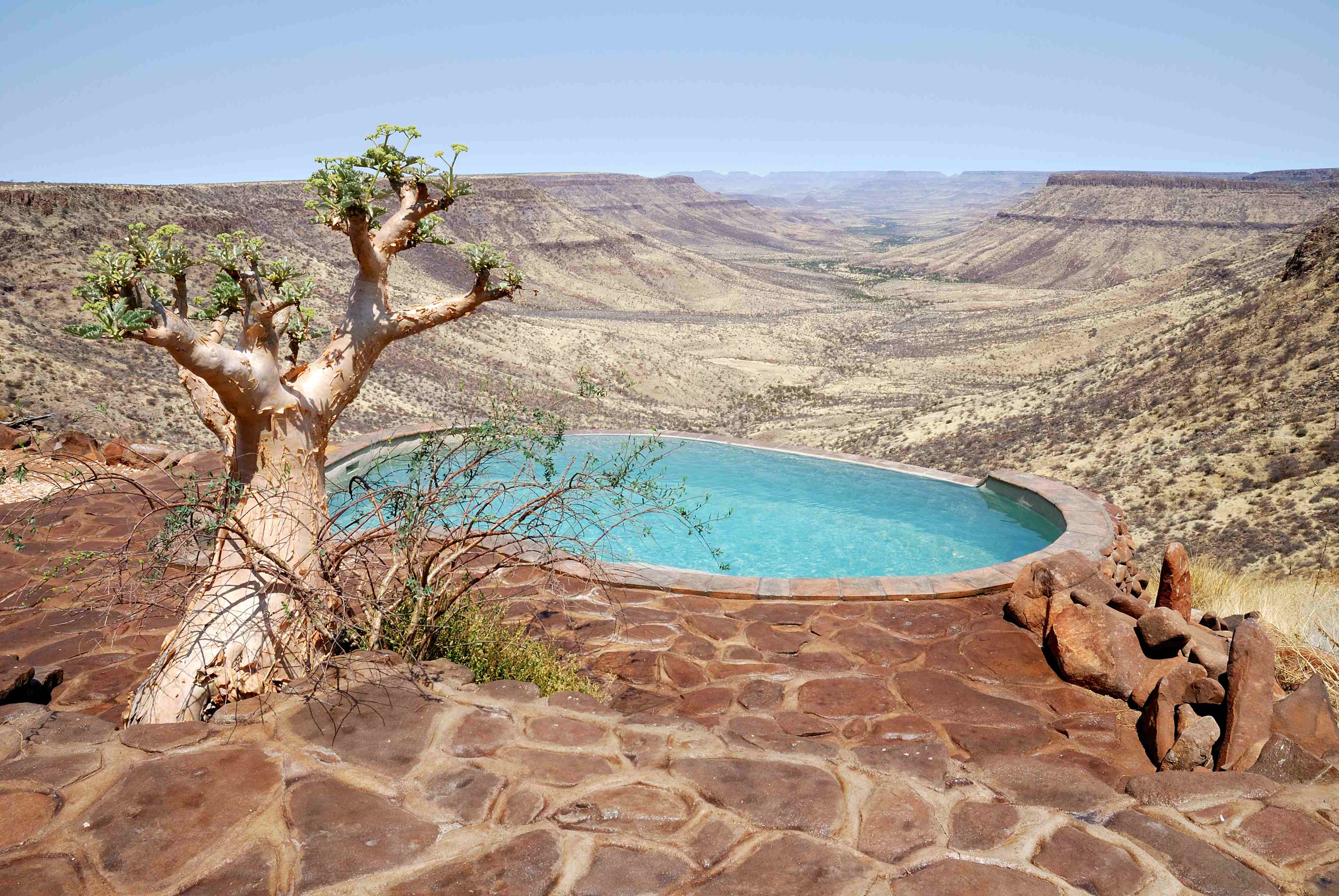 | In Twyfelfontein gibt es Jahrhunderte alte Felszeichnungen der Eingeborenen zu sehen. Die Grootberg Lodge liegt direkt am Rand eines faszinierenden Canyons. Hinter dem Pool geht es 600 Meter in die Tiefe. Fast genauso überwältigend ist der Blick von der Terrasse der Opuwo Lodge. In diesem staubigen Kaff, wo die eingeborenen Himba traditionell unbekleidet durch die Straßen laufen, hätte ich so eine Luxusherberge gar nicht erwartet. | ||||||||||||||||||||||||||||||||||||||||||||||||||||||||||||||||||||||||||||||||||||||||||||||||||||