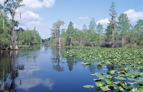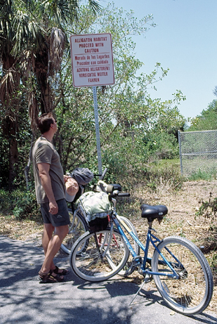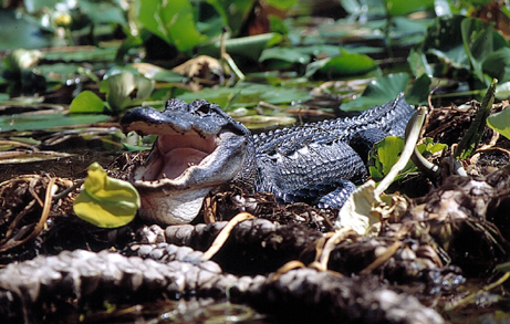 | Im Westen der USA reiht sich ein Nationalpark an den anderen. Hier im Südosten gibt es nur den Everglades N.P. und sonst nichts. Da ist man schon dankbar, einen Tag im Steven C. Foster State Park verbringen zu können. Es macht wirklich Spass, mit einem gemieteten Motorboot durch die manchmal sehr schmalen Flussarme zu fahren und nach Aligatoren Ausschau zu halten. Wenn man den Motor abstellt und dümpelt, dann kommen die kleinen Schnappmäuler auch neugierig ganz dicht ans Boot. |