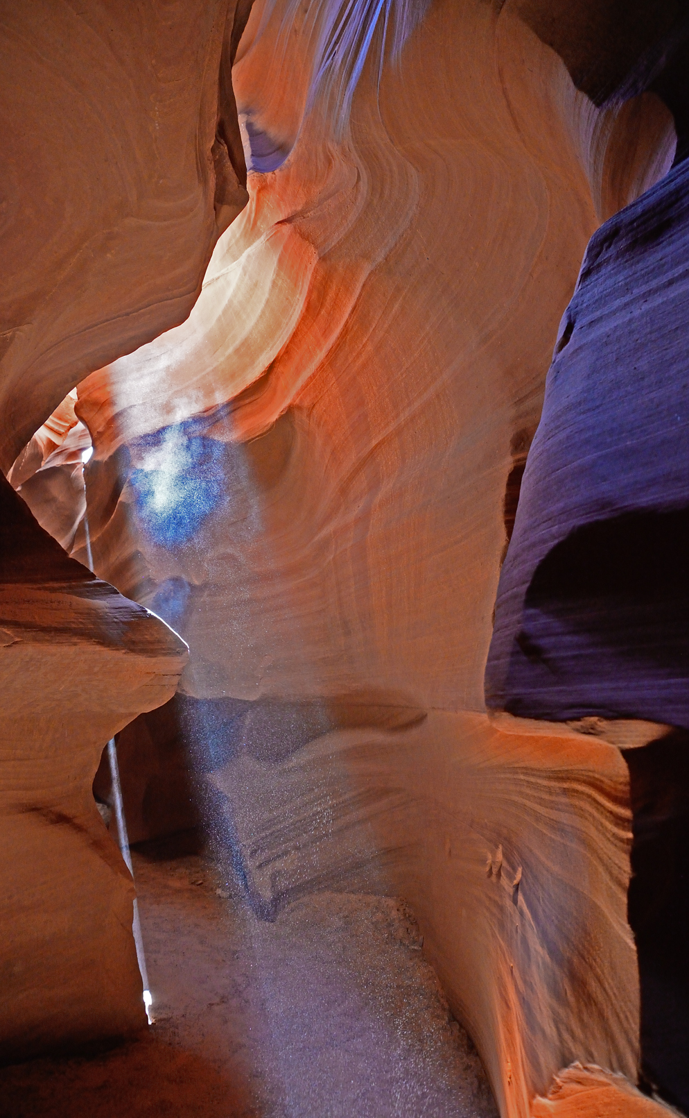 Links: Wenn man Glück hat, dann kann man im völlig überlaufenen Antelope Canyon erleben, wie am Mittag ein Lichtstrahl in den Canyon fällt. Der Nordrand des Grand Canyon ist etwas unterbewertet. Da es hier nur eine einzige Unterkunft gibt, ist man nach der abendlichen Abreise der wenigen Tagestouristen, mit dem Canyon allein. |