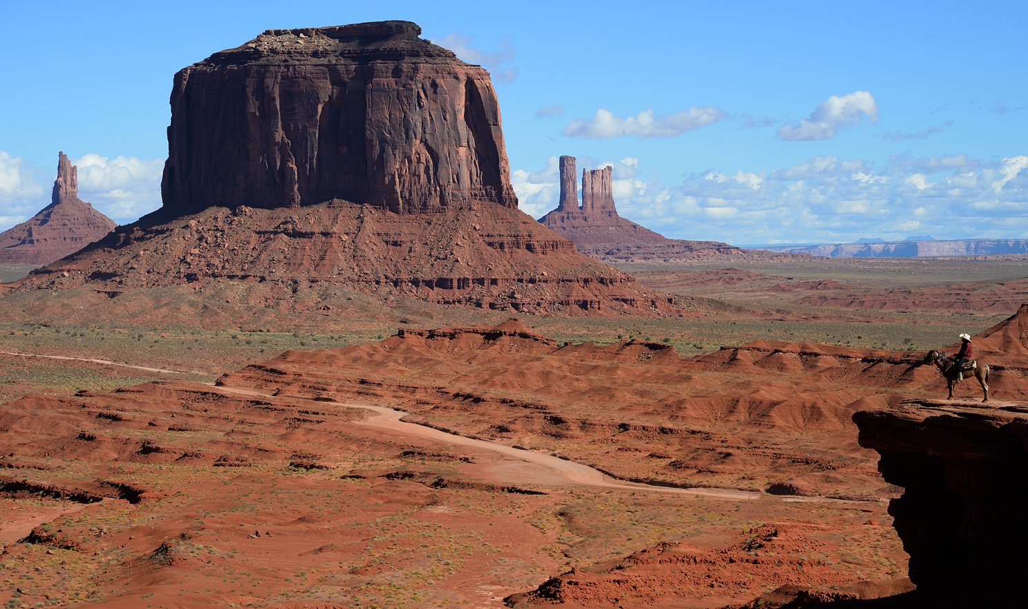 | Fünf Dollar verlagt der "Man on a Horse" dafür, dass man ihn vor der grandiosen Kulisse des John Ford Lookouts ablichten darf. Manchmal gerät er aber auch mehr oder weniger zufällig mit auf ein Foto, so wie es hier rechts der Fall war. | |||||||||||||||||||||||||||||||||||||||||||||||||||||||||||||||||||||||||||||||||||||||||||||
