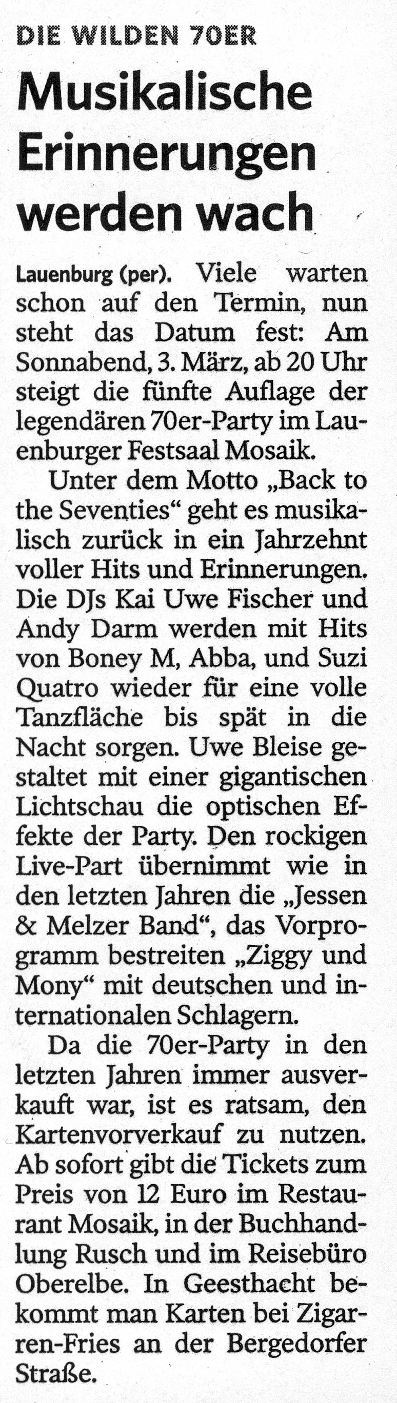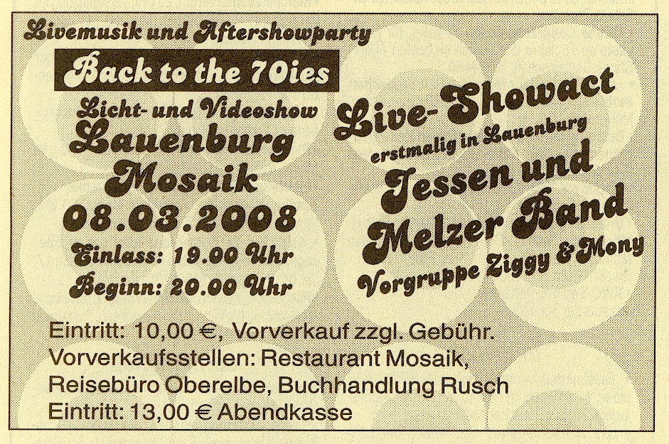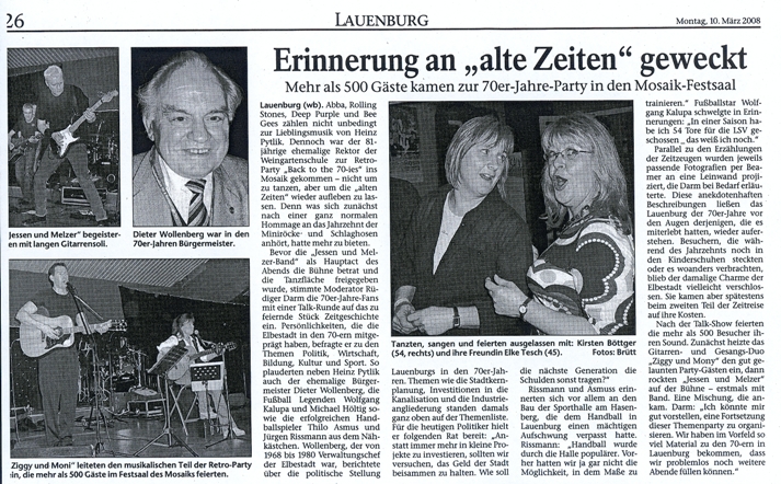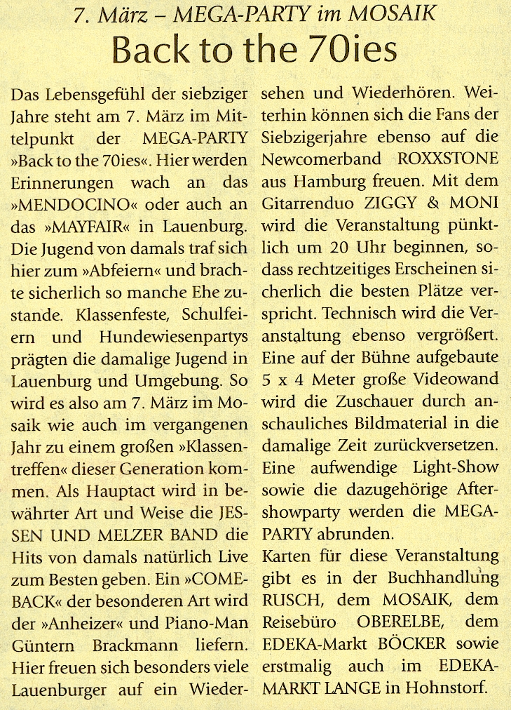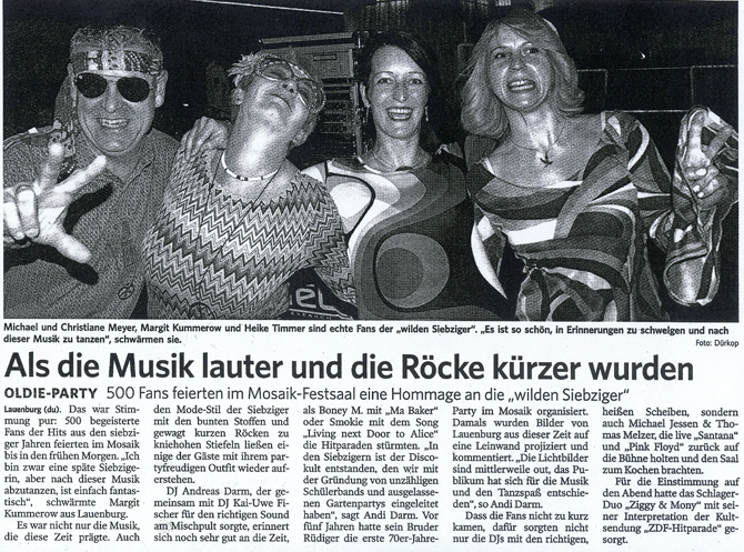Das war ein Fest. Die 70er Jahre Party im Mosaik war ausgesprochen gut besucht. Vielen Dank an dieser Stelle an unsere vielen Freunde und Fans, die uns an diesem Abend so toll unterstützt haben. Das war wirklich sehr freundlich von Euch... | |