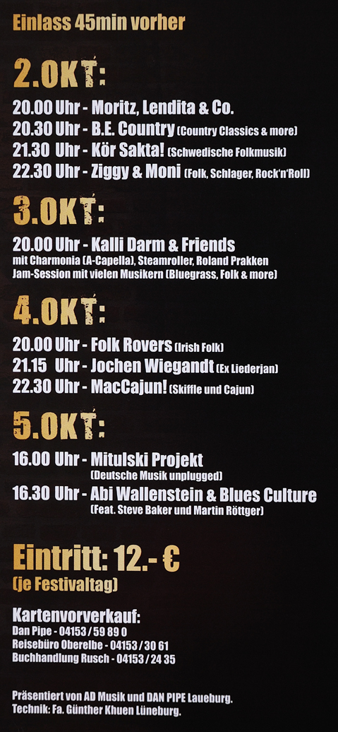 Im September 2007 hatten Mony und ich einen tollen Auftritt im Erbstorfer Lims anläßlich der Silberhochzeit meiner Nachbarn Rüdiger und Christine. Toller Saal, tolle Bühne. Hauptakt dieses tollen Abends übrigens die Braunschweiger Stones Coverband Voodoo Lounge, die mit ihrem unplugged Konzert alle Gäste voll begeistert haben. |